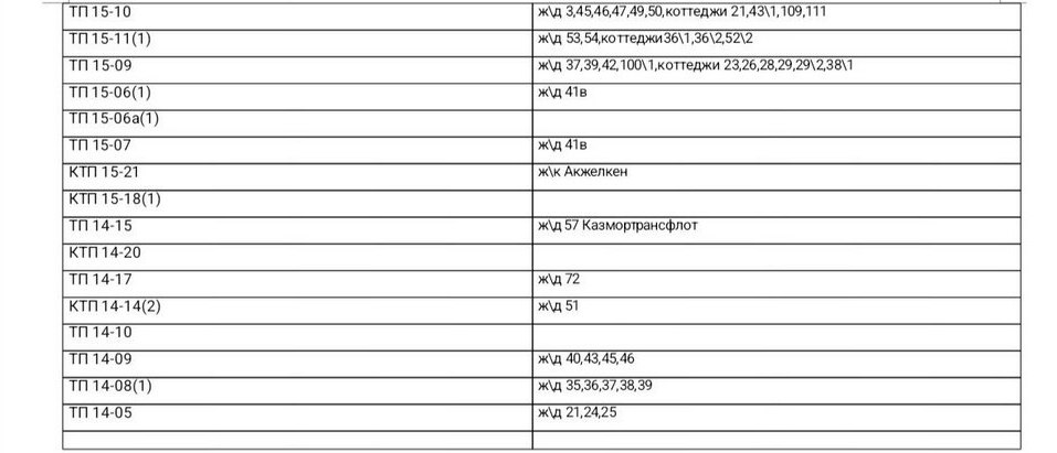 В ГКП «АУЭС» уточнили, что отключения будут частичными - энергетики предоставили список домов и объектов, попадающих под плановые работы. В перечне указаны обозначения подстанций, например ТП15-10, что соответствует 15 микрорайону. Рядом с подстанцией перечислены дома, где временно не будет электричества.