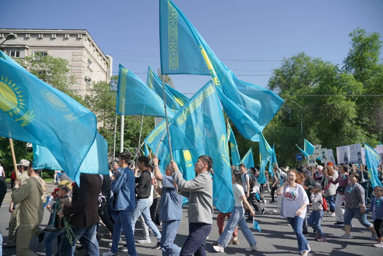 Алматинцы пели песни военных лет, несли в руках портреты участников ВОВ. Со всех сторон звучали поздравления.