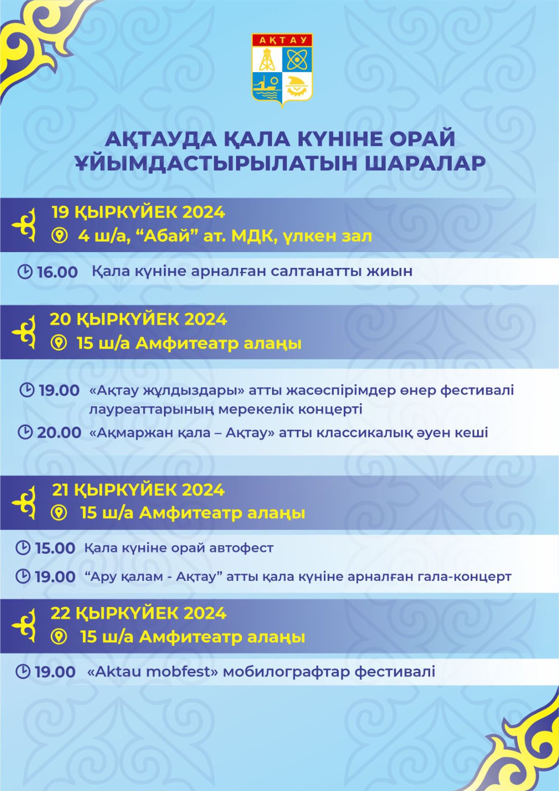 В субботу, 21 сентября, в 15:00 состоится автофест, посвященный Дню города. А в 19:00 на площади амфитеатра пройдет заключительный гала-концерт «Ару қалам Ақтау!» с участием популярных звезд эстрады.
