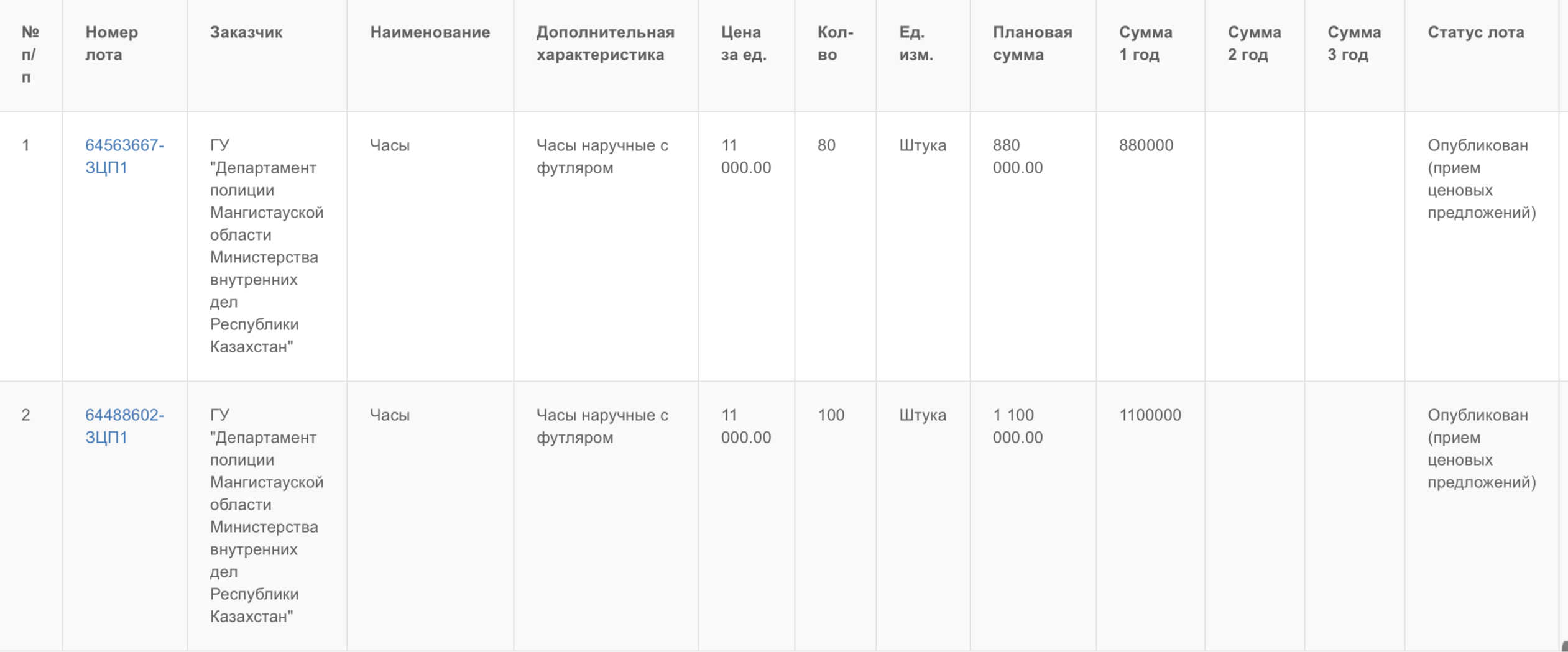 Каждый экземпляр часов обойдется областному департаменту полиции в 11 000 тенге. На комплект женских часов из 80 штук ведомство готовит выделить 880 000 тенге, а на сотню мужских часов - 1 100 000 тенге.