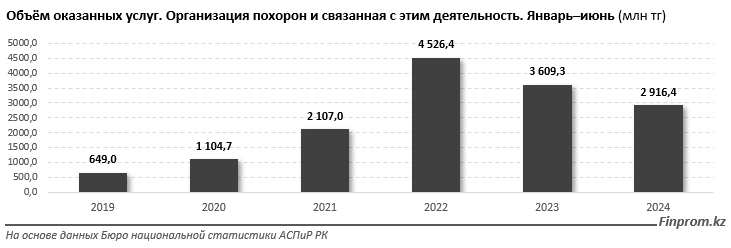 По итогам первого полугодия 2024 года объём услуг по организации похорон и связанной с этим деятельности в РК составил 2,9 млрд тг — на 19,2% меньше, чем годом ранее. В целом с пикового 2022 года объём услуг в этой сфере сокращается.