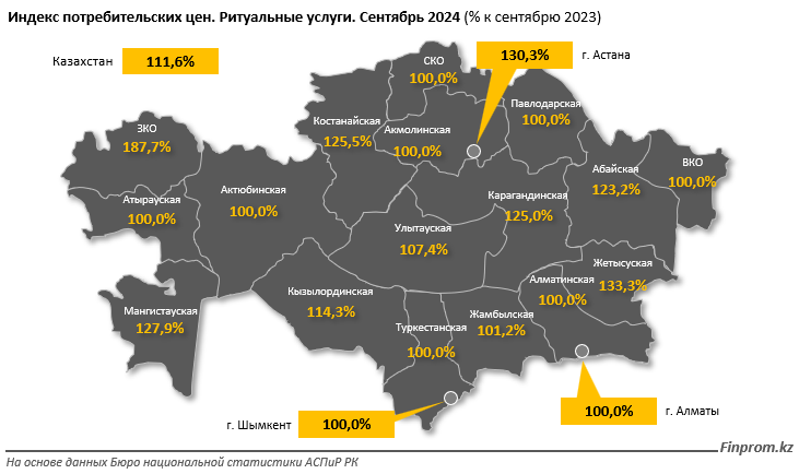 При этом в ряде регионов был отмечен колоссальный рост цен, заметно превышающий среднереспубликанский. Так, в Западно-Казахстанской области ритуальные услуги подорожали сразу на 87,7% за год, в Жетысуской — на 33,3%, в Астане — на 30,3%, в Мангистауской области — на 27,9%, в Костанайской — на 25,5%, в Карагандинской — на 25%, в Абайской области — на 23,2%. Наименьший годовой рост цен был отмечен в Жамбылской области: на 1,2%.