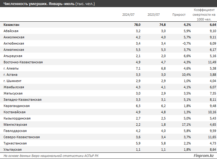 Приведём печальную статистику по смертности. За январь–июль текущего года в Казахстане ушли из жизни 78 тыс. человек — на 4,2% больше, чем за аналогичный период 2023-го.