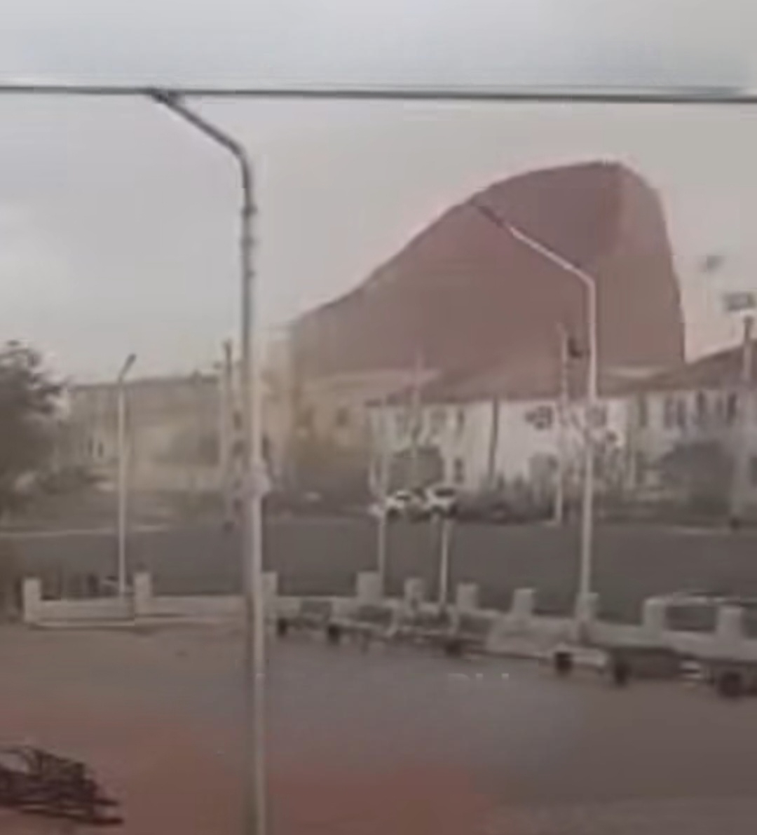 В поселке Жетыбай ветер сорвал часть крыши средней школы №3. В соцсетях появилось видео с метеорологической картой Мангистау - на нем в районе села Курык буквально происходит столкновение нескольких воздушных масс.