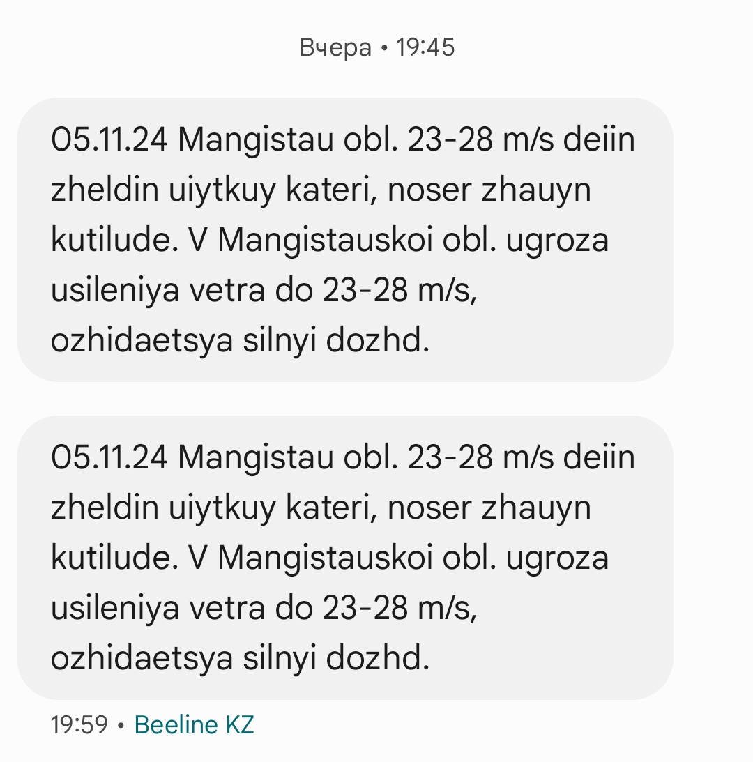 Накануне жителям Мангистауской области прислали предупреждение от Службы спасения 112, в котором говорилось, что 5 ноября ожидаются усиление ветра до 23-28 м/с и сильный дождь.