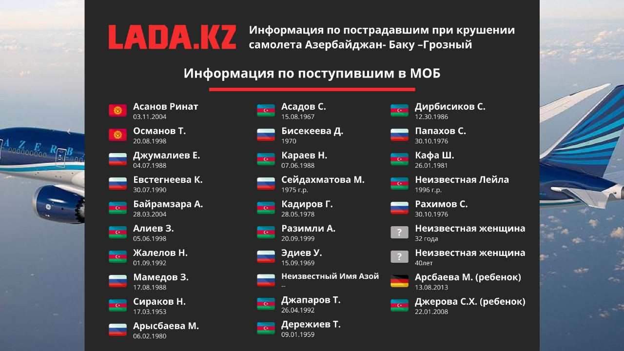 Напомним, вблизи аэропорта Актау разбился самолет азербайджанской авиакомпании Azerbaijan Airlines. На место происшествия выехали спасатели, стало известно о наличии выживших в авиакатастрофе. К городскому моргу привезли тела погибших. Авиакомпания организовала горячую линию. Управление здравоохранение опубликовало список пострадавших в авиакатастрофе, за жизни которых борются казахстанские врачи. Жителей Мангистау призвали стать донорами крови для пострадавших. В связи с трагедией в Актау отменили все общегородские праздничные мероприятия.