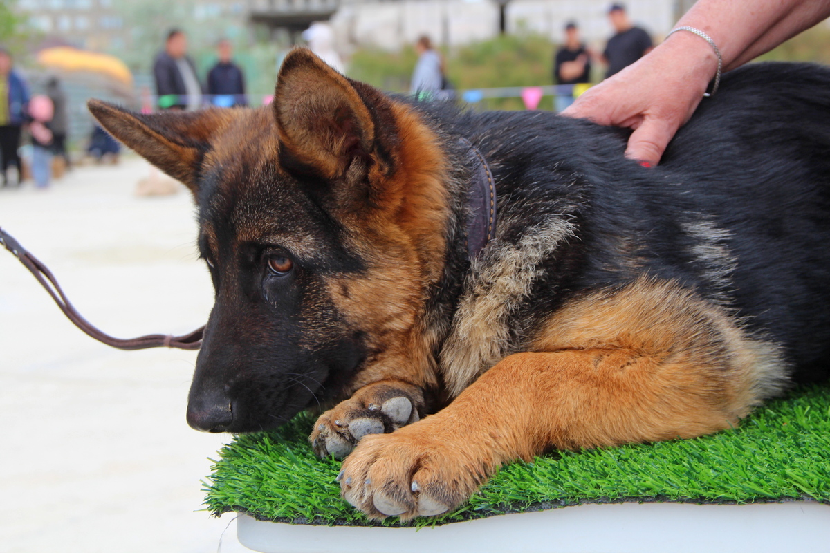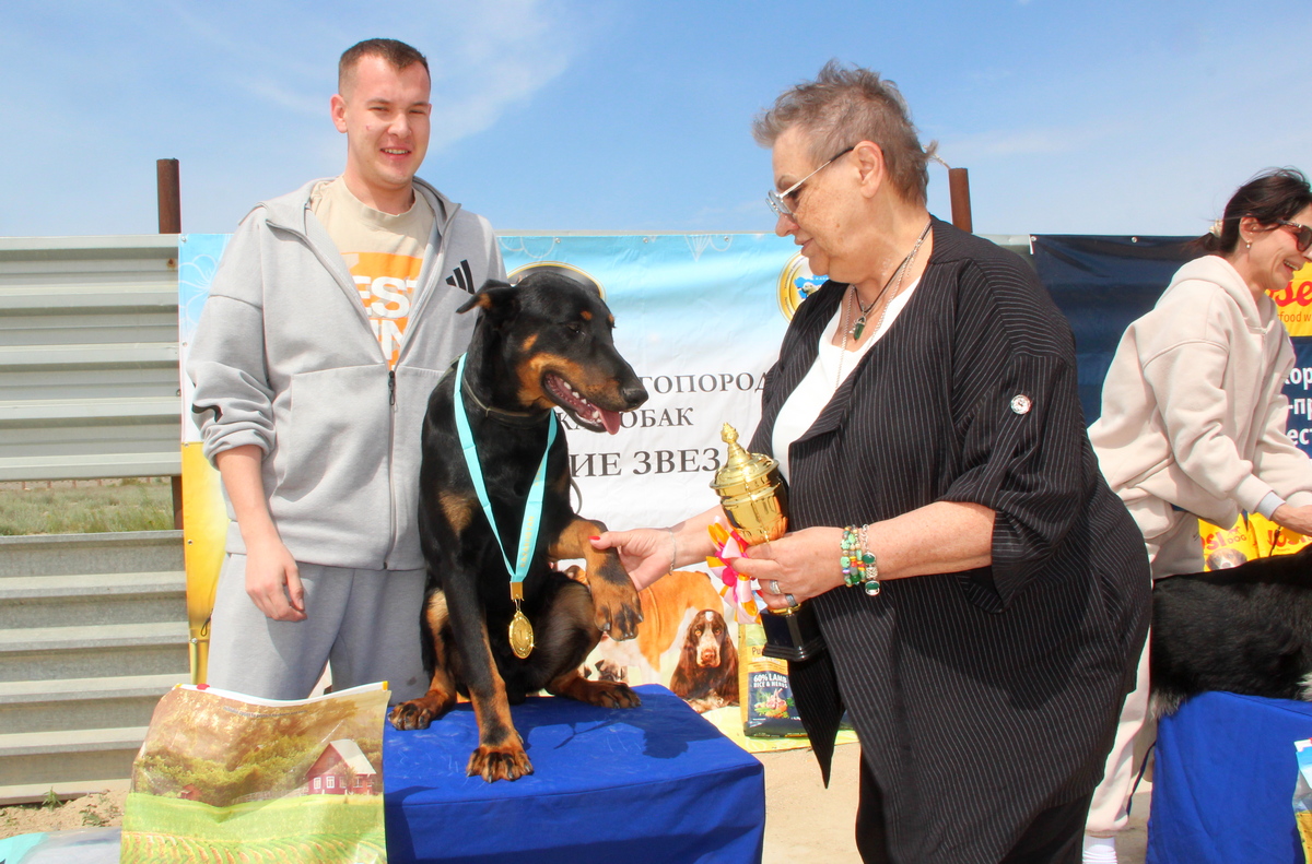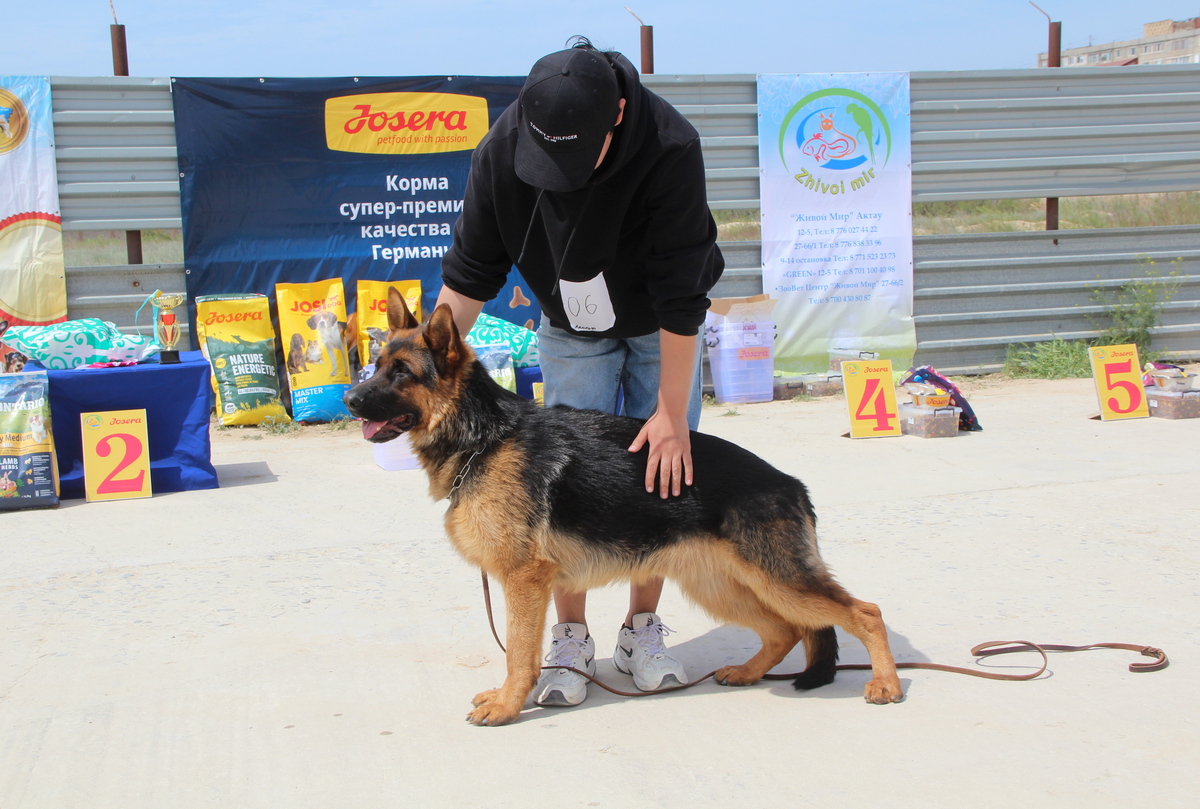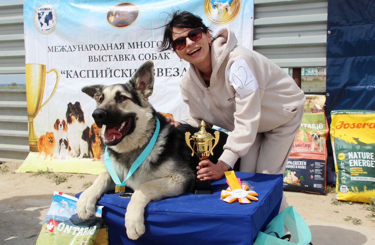 Немецкая овчарка Бакарди приехала из Алматы. Сейчас она живёт с хозяйкой в Жанаозене. В выставке участвовала впервые — в классе «бейби». Заняла первое место.