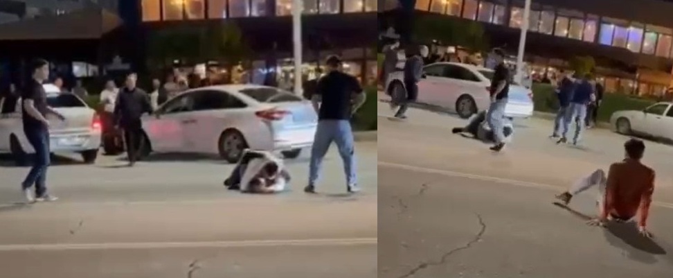 На кадрах, снятых очевидцем, видно, как группа мужчин из примерно десяти человек выясняет отношения на проезжей части напротив ресторана Pinta, расположенного в 5-м микрорайоне областного центра.