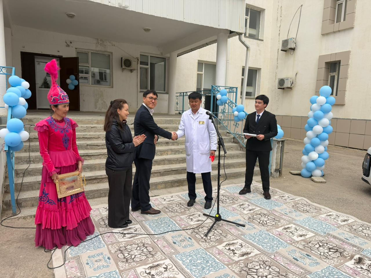 Ключи от автомобиля были торжественно вручены руководству медучреждения заместителем генерального директора головного офиса Мён Джун Кимом, приехавшим из г. Алматы.