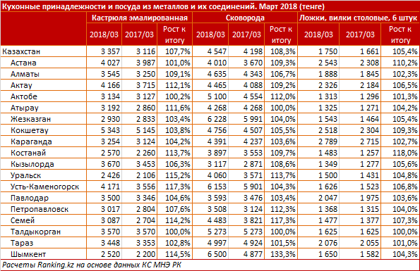 портала, стоит в среднем 4 166 тенге. За год цены выросли в среднем на 12,1 процента. Стоимость кастрюли в республике оценили в 3 357 тенге.