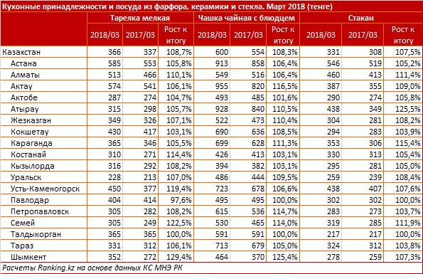 Ranking.kz подсчитал и стоимость посуды из фарфора, керамики и стекла.