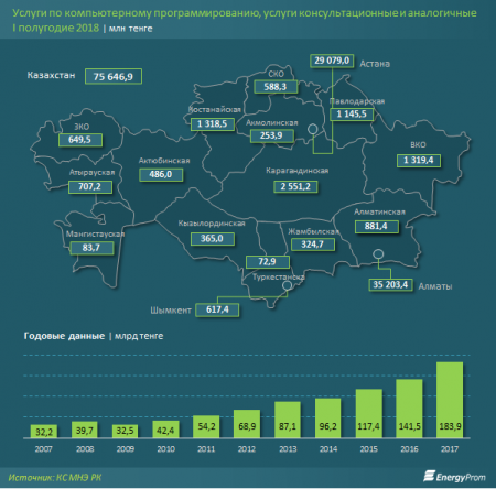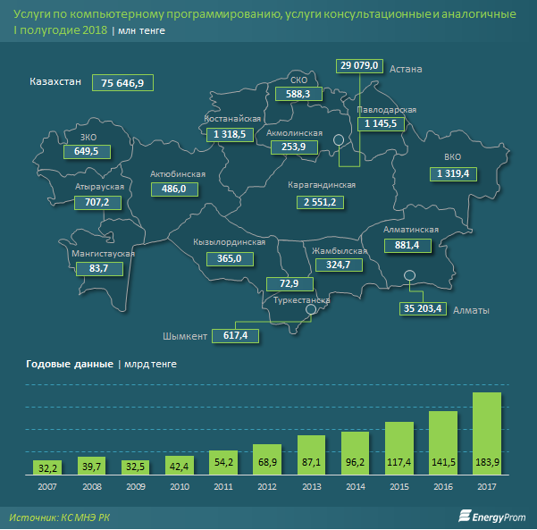 Лидерами стали Алматы (35 203,4 миллиона тенге) и Астана (29 079 миллионов тенге). Доля услуг по программированию и консультированию в двух городах составила 85 процентов от общего объема в республике.
