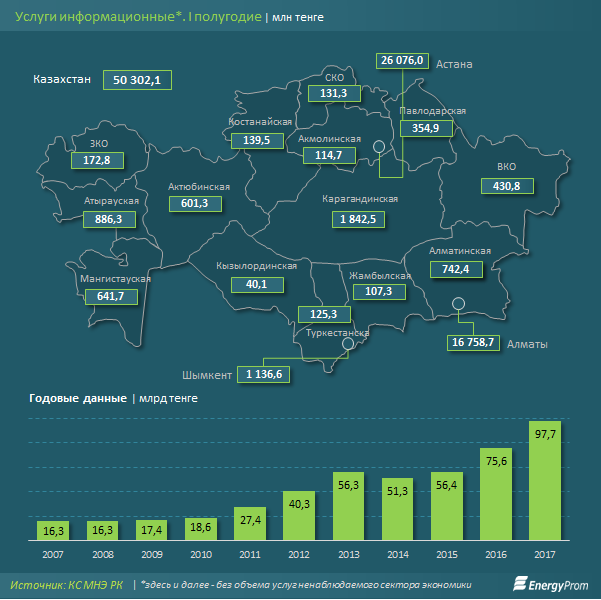 Лидером по объему информационных услуг стала Астана (26 076 миллионов тенге). На втором месте Алматы (16 758,7 миллиона тенге). Замыкает тройку Карагандинская область (1842,5 миллиона тенге).
