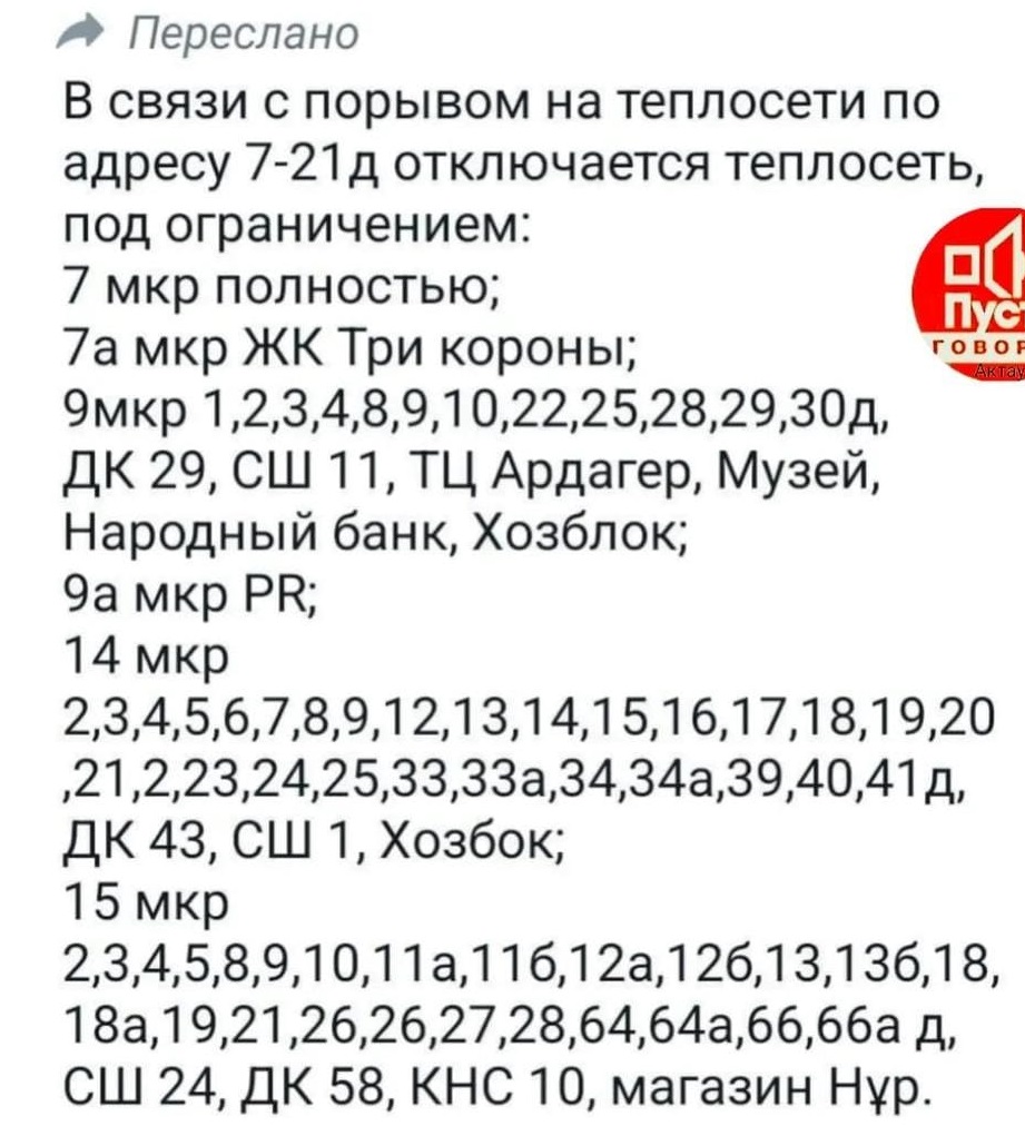 - В связи с порывом на теплосети по адресу 7-21 отключается теплосеть, под ограничением: 7 микрорайон полностью; 7А микрорайон ЖК «Три короны»; 9 микрорайон: 1, 2, 3, 4, 8, 9, 10, 22, 25, 28, 29, 30 дома, ДК 29, СШ №11, ТЦ «Ардагер», музей, здание «Народный банк», «Хозблок»; 9А микрорайон PR; 14 микрорайон: 2, 3, 4, 5, 6, 7, 8, 9, 12, 13, 14, 15, 16, 17,18, 19, 20, 21, 22, 23, 24, 25, 33, 33А,34, 34А, 39, 40, 41 дома, ДК 43, СШ №1, «Хозбок»; 15 микрорайон: 2, 3, 4, 5, 8, 9, 10, 11А, 11Б, 12А, 12Б, 13, 13Б, 18, 18А, 19, 21, 26, 26, 27, 28, 64, 64А, 66, 66А дома, СШ № 24, ДК 58, КНС 10, магазин «Нұр», - говорится в сообщении горожан.