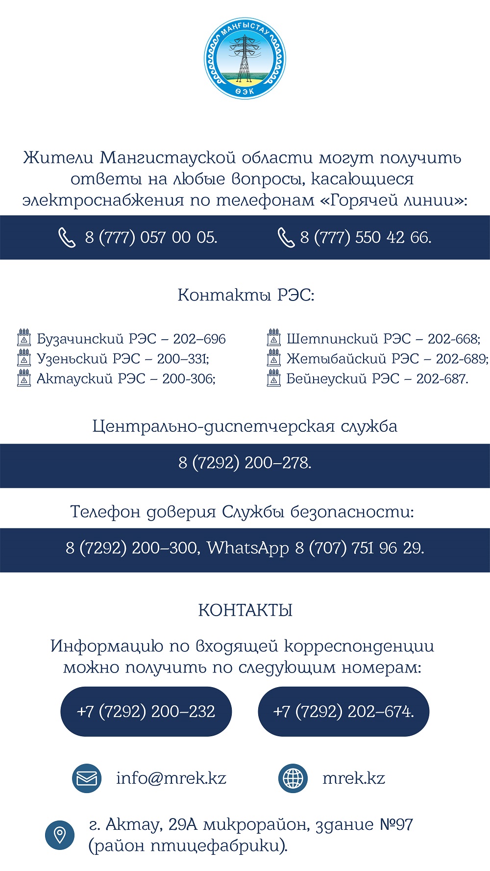 info@mrek.kz.Кроме того, в АО «МРЭК» функционирует телефон доверия Службы безопасности АО «МРЭК» -