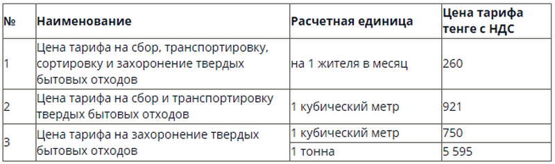 Согласно документу, тариф на сбор, транспортировку, сортировку и захоронение ТБО на одного жителя в месяц может составить 260 тенге. Цена за сбор и транспортировку одного кубического метра ТБО – 921 тенге. Тариф на захоронение одного кубического метра ТБО - 750 тенге, одной тонны - 5 595 тенге.