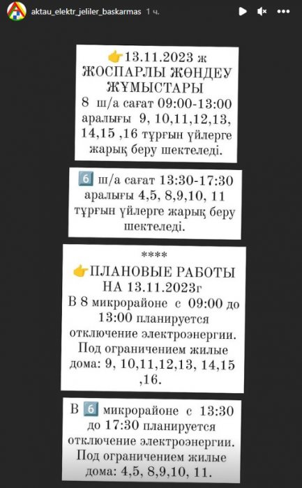 Как сообщили в ГКП «АУЭС», работы запланированы на сегодня, 13 ноября, в 8 и 6 микрорайонах.