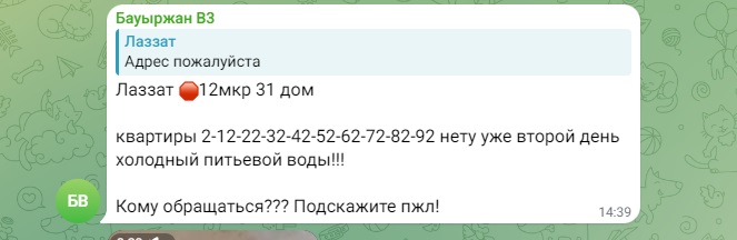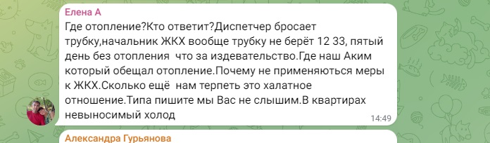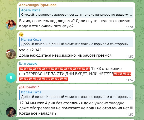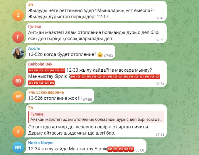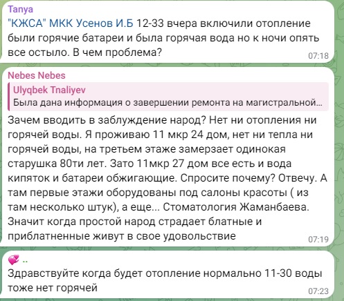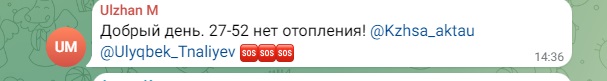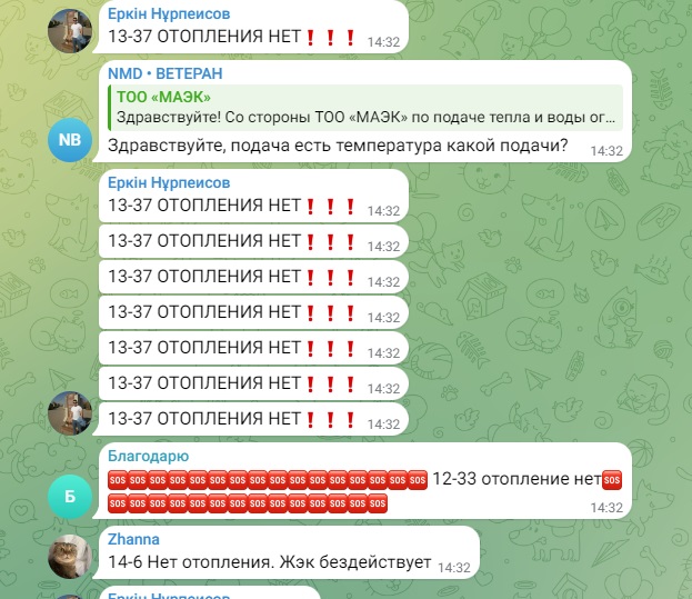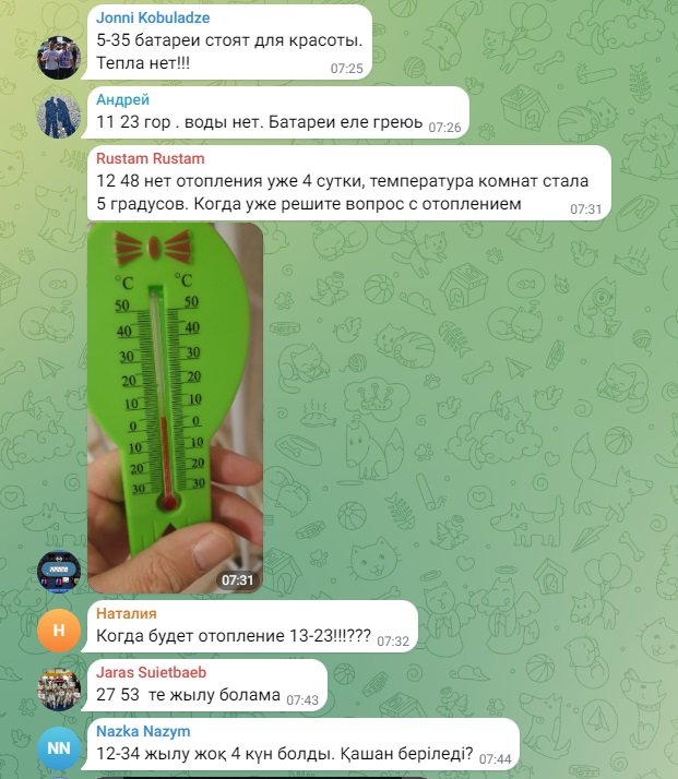 - Весь город пишет... пишет, но никаких действий со стороны акимата, обслуживающих служб нет. Такой ощущение, что пишем просто в бездну. Ни ответа, ни привета. Дохлое отопление, которое почему-то называют штатным. И платим за него, как за сахар. Также работают 2 обогревателя. И так же, как у всех, из крана с горячей водой бежит холодная. Полотенцесушитель тоже холодный. Хочется у акима спросить: эту ситуацию вы считаете нормой? Рапортуете президенту, что всё под контролем. Жители этого не видят, не ощущают, мёрзнут и болеют, - пишут люди.