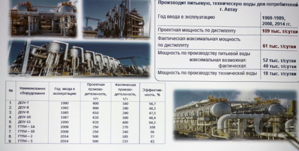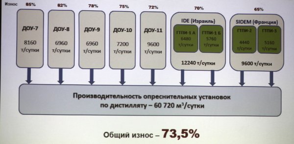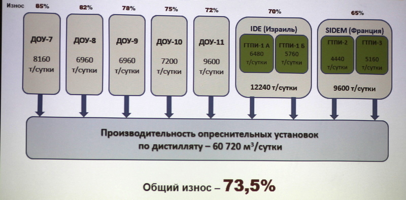 - Из них мы сохранили пять, которые были построены в период с 1969 по 1989 годы. А также есть две относительно новые установки израильского и две французского производств. Та проектная мощность, которая закладывалась по данным установкам в размере 109 тысяч тонн в сутки, фактически не выдерживается. Практически половину данной величины мы имеем в работе на установках по выпариванию морской воды, - говорит гендиректор предприятия.