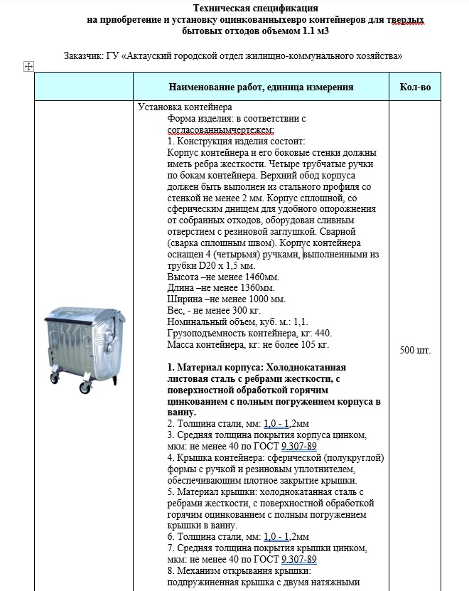 Редакция обнаружила на сайте госзакупок лот на приобретение и установку оцинкованных евроконтейнеров для твёрдых бытовых отходов объёмом 1,1 кубометра. Закуп был проведён ещё в августе 2025 года. На эти цели власти выделили 89 285 500 тенге. Согласно документации, поставщик обязан поставить 500 контейнеров, при этом стоимость одного составляет 178 571 тенге.