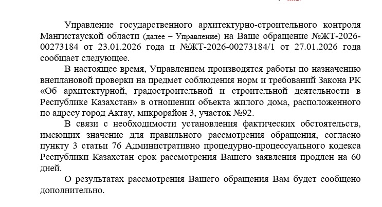 В ГАСК руководство проигнорировало вопросы журналиста, поэтому 16 марта был направлен запрос через платформу E.Otinish, однако срок рассмотрения обращения установлен до 10 апреля. Однако, судя по уведомлениям, 17 марта ГАСК переадресовал обращение корреспондента в городской отдел архитектуры и градостроительства, городскую жилищную инспекцию, а также в департамент санитарно-эпидемиологического контроля Мангистауской области.