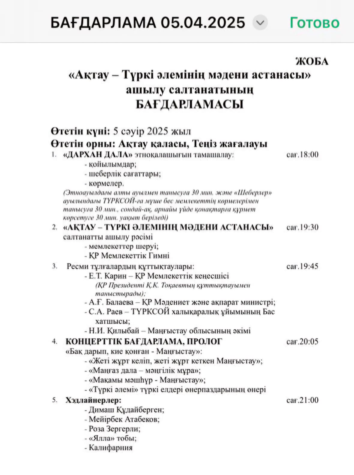 Официальную программу мероприятий «Актау- культурная столица тюркского мира» чиновники пообещали предоставить уже завтра, 28 марта.