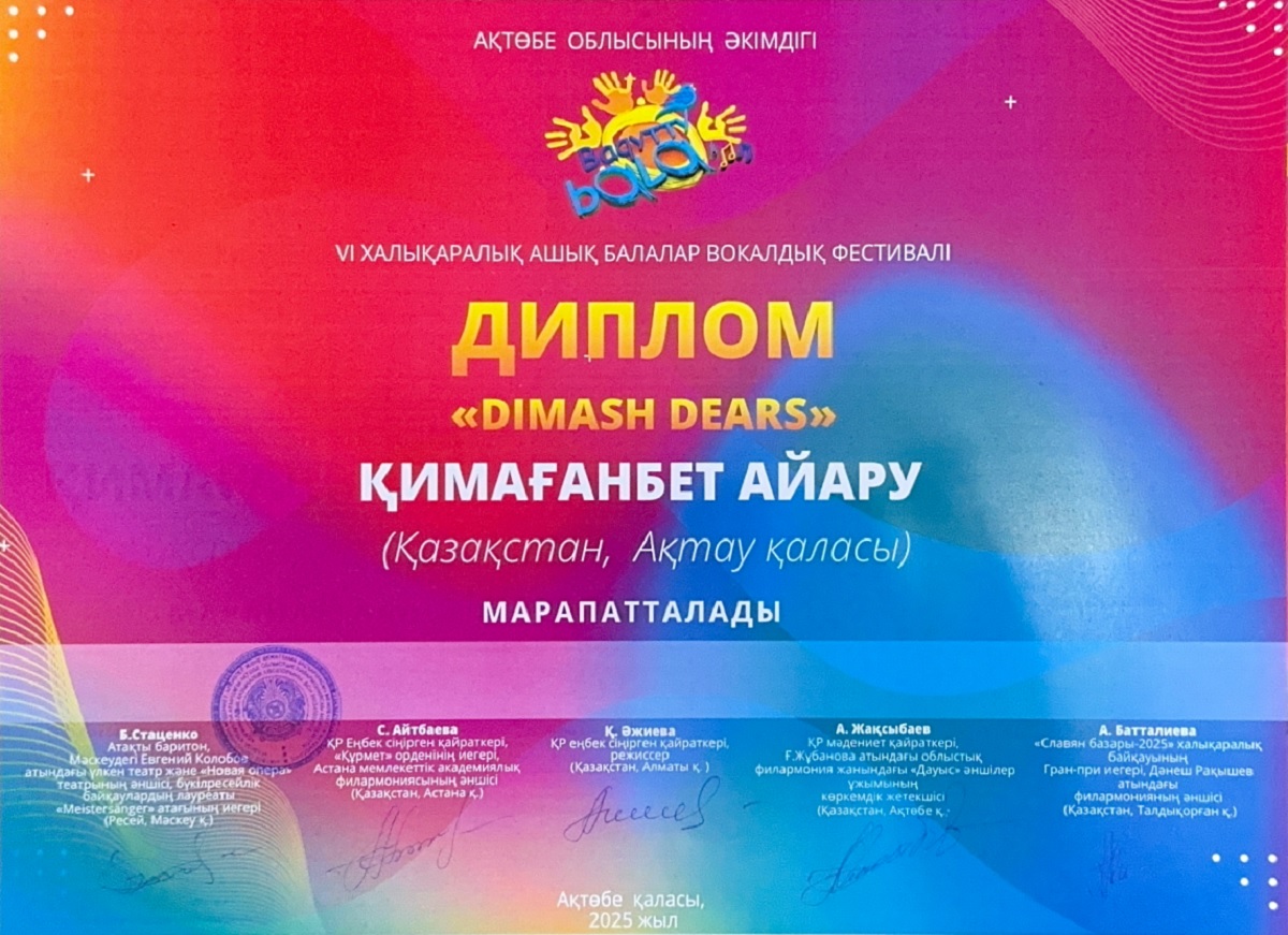 «Baqytty Bala» – это уникальный детский проект, который уже стал брендом Актюбинской области. Для нас большая честь, что наш регион на конкурсе представляли Айару Кимаганбет и Амина Асгатова. По результатам оценивания жюри Айару удостоена специальной премии «Dimash dears» и сертификата на 100 000 тенге. Айару занимается в нашей студии с сентября 2016 года. За это время она получила всестороннее творческое развитие. С ней работают педагоги по вокалу, сценическому мастерству и хореографии (педагоги Черкашина О. Н., Литау В. А., Ким А.В). Айару – девочка яркая, талантливая, очень способная и активная. У неё уже есть собственный репертуар, и она исполняет песни на казахском, русском, английском и других языках, - рассказала Ольга Хныкина, руководитель студии детского творчества «Радуга».