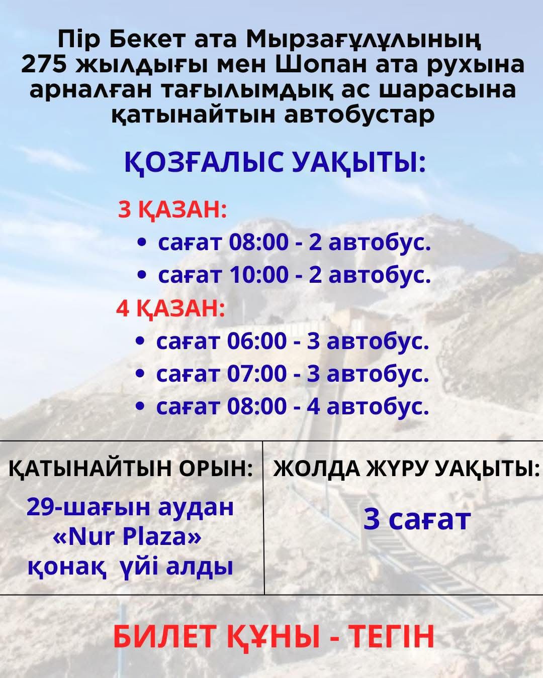 Автобусы отправятся со стоянки перед гостиницей «Нур Плаза» в 29 микрорайоне.