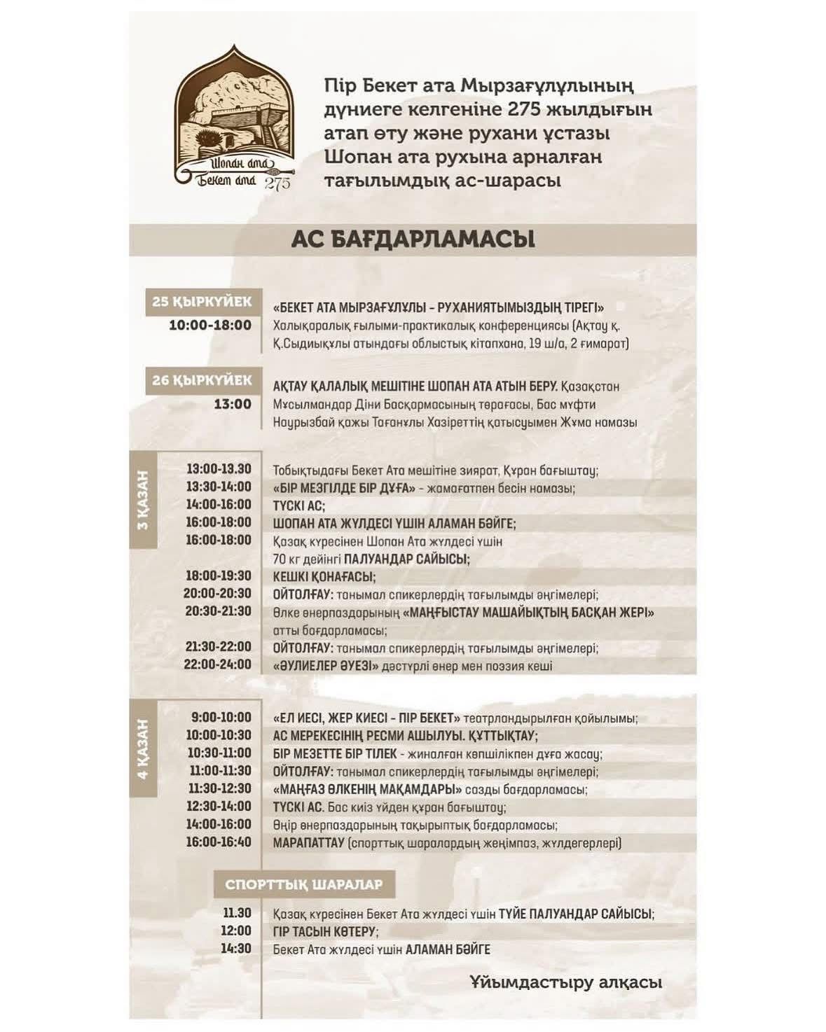 В местности Тобыкты 3 и 4 октября пройдет торжественный ужин, посвященный 275-летию со дня рождения Бекет-ата Мырзагулулы и памяти его духовного наставника Шопана-ата, сообщает Lada.kz со ссылкой на региональный центр общественных коммуникаций.