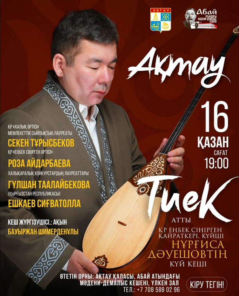 По информации городской администрации, в КДК имени Абая состоится музыкальный вечер кюев под названием «Тиек», сообщает Lada.kz.
