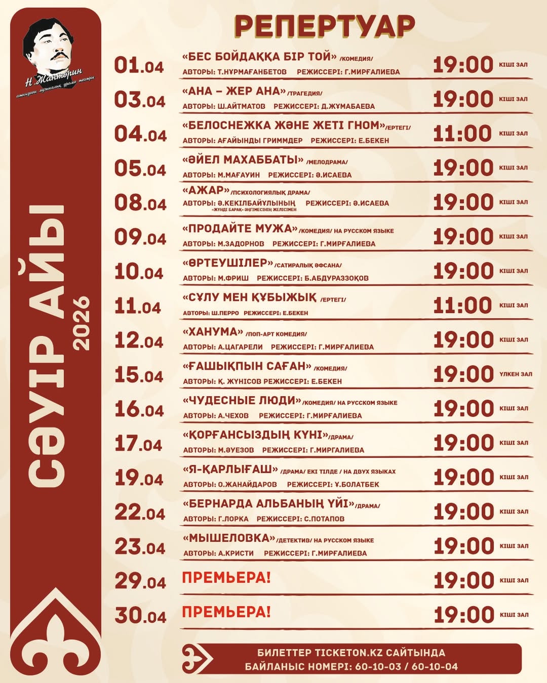 - 11 апреля – «Сұлу мен құбыжық» (детская сказка), 11:00 часов;