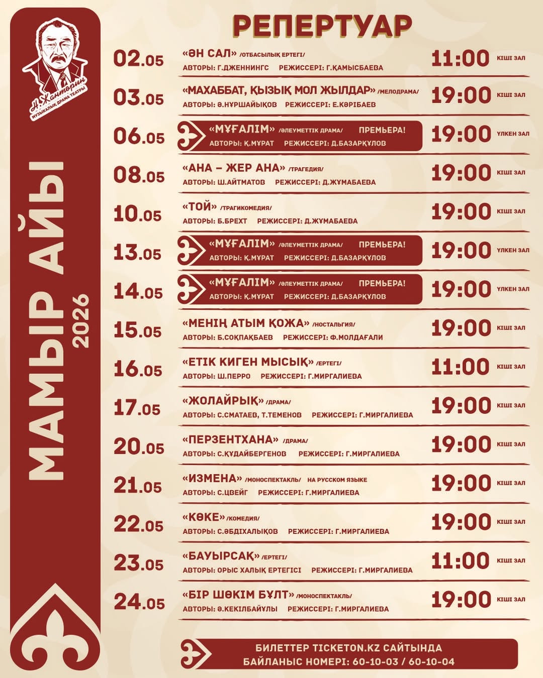 Главным событием мая станет премьера социальной драмы «Мұғалім» (автор – К. Мұрат, режиссер – Д. Базарқұлов). Постановку представят в большом зале трижды: 6, 13 и 14 мая.