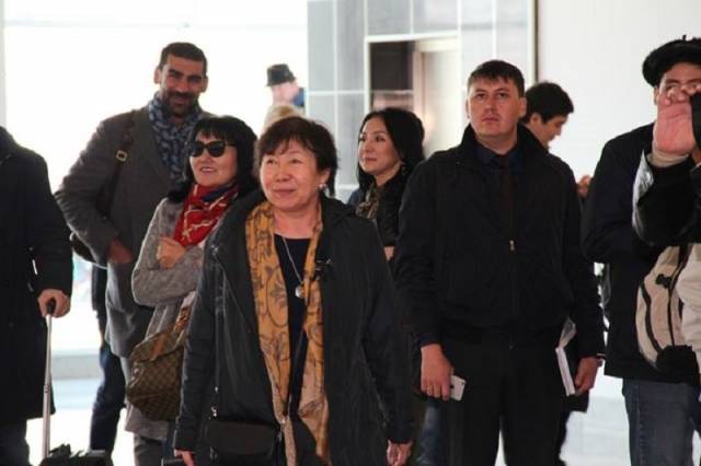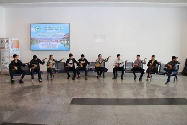 Пока пассажиры трех внутренних рейсов, прилетевших из южной и северной столиц Казахстана и соседнего Атырау, ждали свой багаж, домбристы Мангистауской области подарили им несколько музыкальных произведений, в том числе один из самых известных кюев Мангистау - кюй «Адай».
