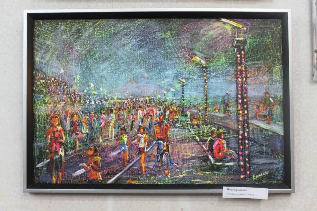 Любимое произведение Инны Ермаковой — картина «Ночной Актау» в технике граттаж. Эта техника отличается контрастом цветных линий на черном фоне. Здесь Инна постаралась передать эффект свечения.