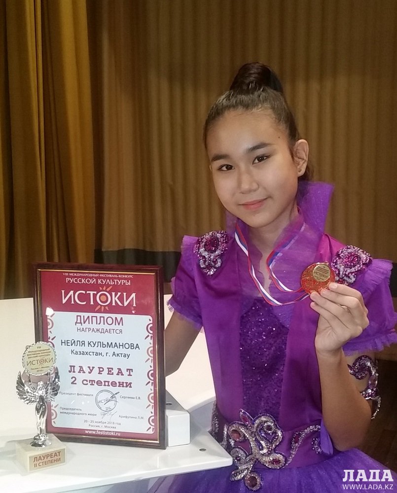 Международный фестиваль-конкурс «Истоки» проходил в Москве. В нем приняли участие 22 конкурсанта из 14 стран мира. Нейля Кульманова представляла Актау (Казахстан) и завоевала второе место. Об этом сообщили в Студии детского творчества «Радуга».