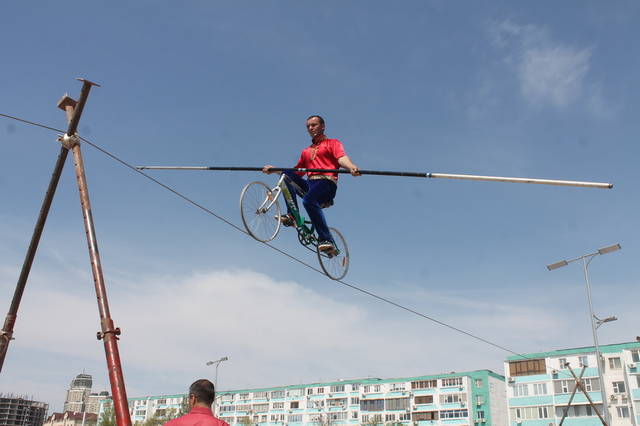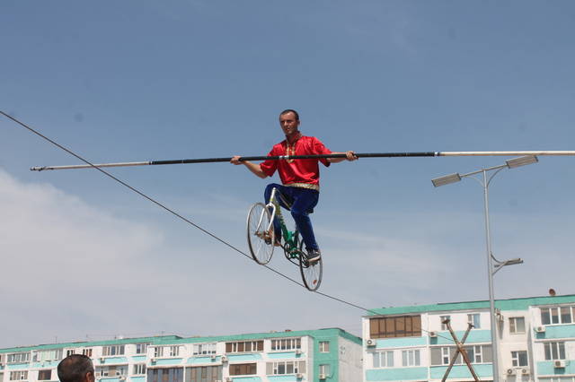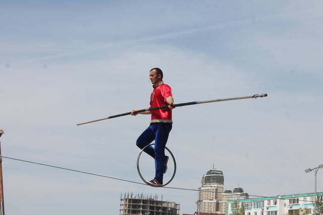 Перед публикой в четырех метрах над землей на натянутом тросе парил 29-летний потомственный канатоходец Виталий Касымов. Он уверенно держал равновесие, подпрыгивал, выполнял сложные акробатические трюки. Балансируя, он продвигался на обруче и велосипеде, чем очень впечатлил горожан.