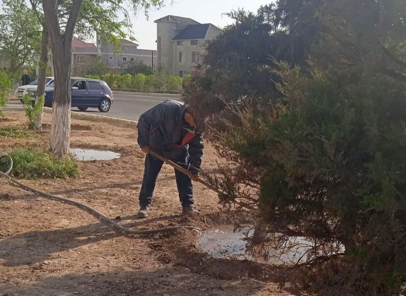 Из водовозов поливают зелёные насаждения возле торгового центра «Байтерек», периметр 6, 8, 9, 11, 12, 14 микрорайонов, вдоль автодороги №18, напротив жилого комплекса «Green Park» и у областной мечети.