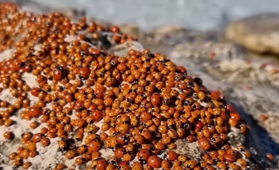 Нашествие божьих коровок в прибрежной зоне сняла на видео жительница Актау Ольга Михайлова. Сотни насекомых облюбовали скалы.