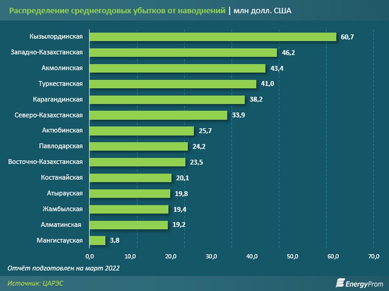 В Кызылорде зафиксирован самый большой среднегодовой ущерб: 60,7 миллиона долларов. В Западно-Казахстанской, Акмолинской и Туркестанской областях ущерб превышает 40 миллионов долларов в год. Мангистауская область в этом списке занимает последнее место - 3,8 миллиона долларов.