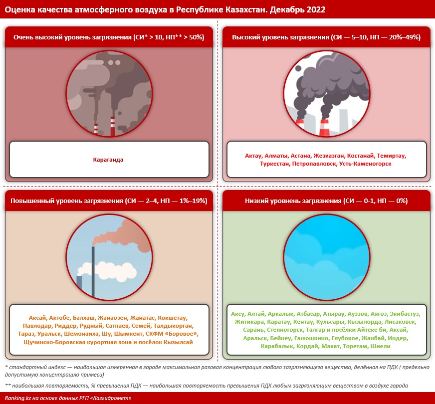 За последние пять лет, с 2018 по 2022 годы, стабильно высокий уровень загрязнения атмосферного воздуха наблюдается в Астане, Караганде, Жезказгане и Темиртау. Среди городов с высоким уровнем загрязнения числится и Актау.
