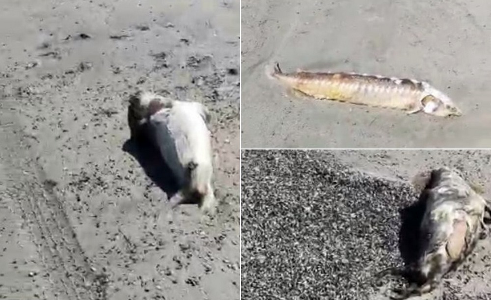 На берегу близ Форт-Шевченко засняли скопище тушек тюленей, бельков и краснокнижкой рыбы.