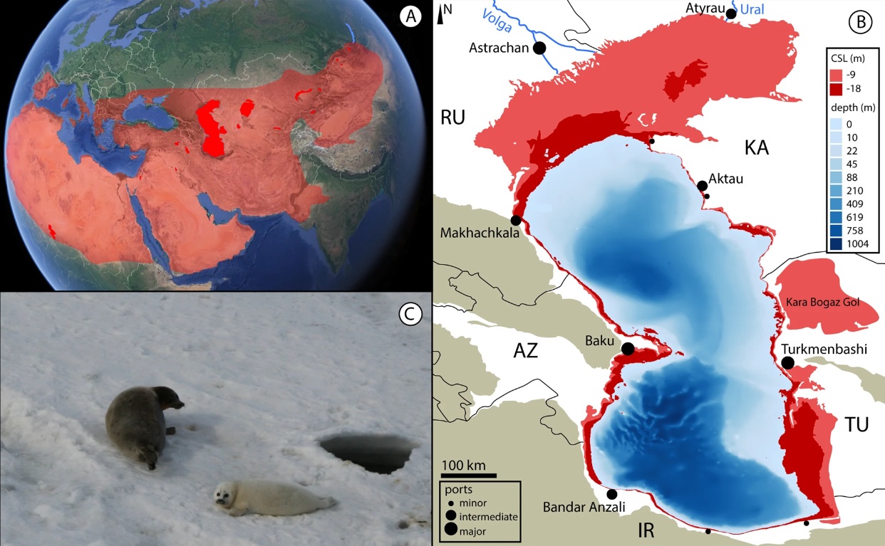 А — регионы, пострадавшие от сильного высыхания, согласно прогнозу на 2080-2099 годы. В — влияние прогнозов уровня Каспийского моря в -9, -18 м (красные регионы засыхают). С — находящийся под угрозой исчезновения каспийский тюлень // Фото: nature.com