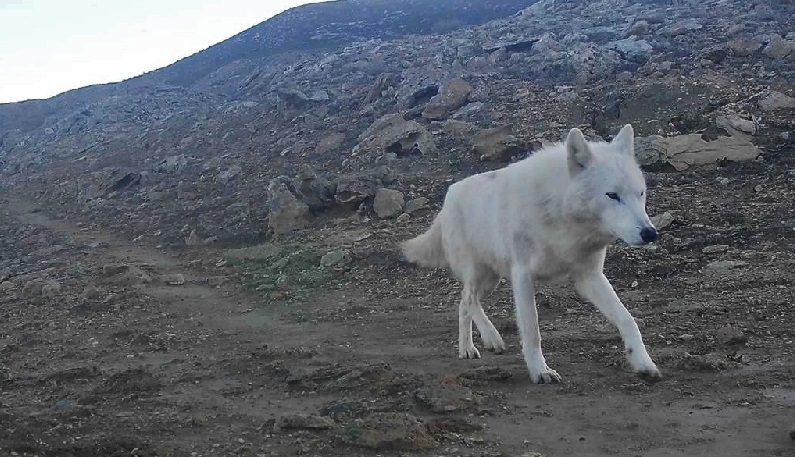 Фото белого волка с фотоловушки, установленной сотрудниками природного парка «Кызылсай»
