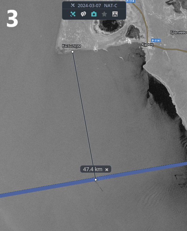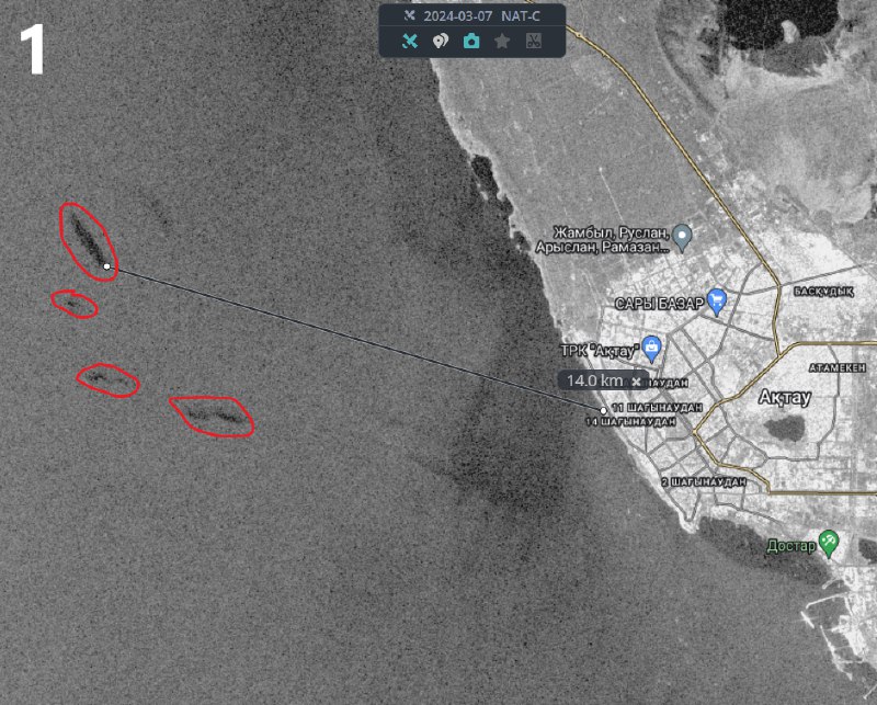 - На первом снимке вероятно 4 судовых сброса, примерно в 14 км от побережья Актау, общей площадью 0,93 кв.км. На снимках 2 и 3 - вероятный судовой сброс, примерно в 48 км от побережья Кызылкум, площадью 0,96 кв.км территориальные воды Казахстана, - говорится в сообщении.
