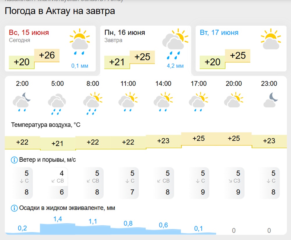 По информации «Gismeteo», 16 июня в Актау прогнозируется дождь и пасмурная погода. Температура днём составит +21°C, ночью — +25°C.