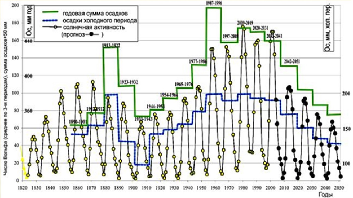 Особое внимание в работе уделено связи колебаний уровня Каспийского моря с солнечной активностью. Метод гелиомакропрогнозирования позволил выявить корреляцию между солнечными циклами, количеством осадков в бассейне Волги и фазами увлажнения территории. По словам учёного, именно эти процессы формируют климатические ритмы продолжительностью 50-60 и около 120 лет, которые и определяют периоды подъёма и спада уровня Каспия.