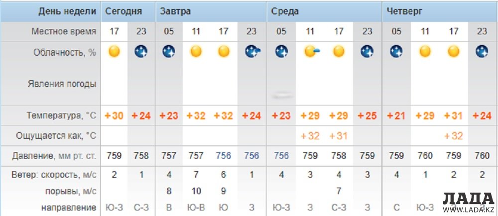 Средняя температура воздуха составит + 30°С. Осадков в ближайшие три дня, по прогнозу синоптиков, в Актау не ожидается.