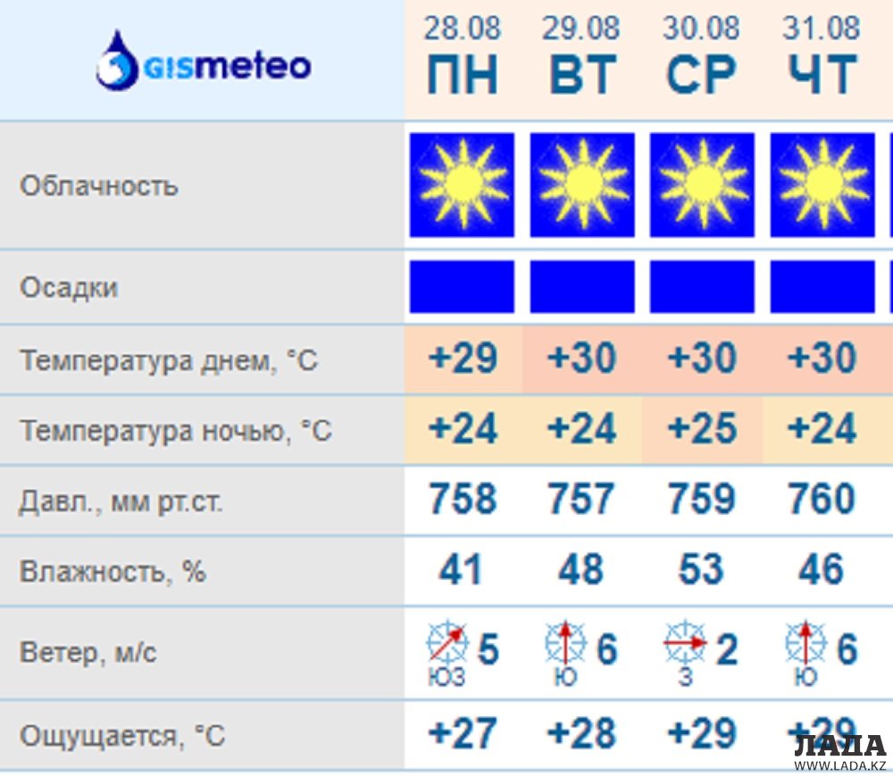 По данным gismeteo.kz, 29 августа синоптики прогнозируют в Актау солнечный день. Температура воздуха составит +30°С днём, ночью +24°С. Ветер 3-6 м/с.