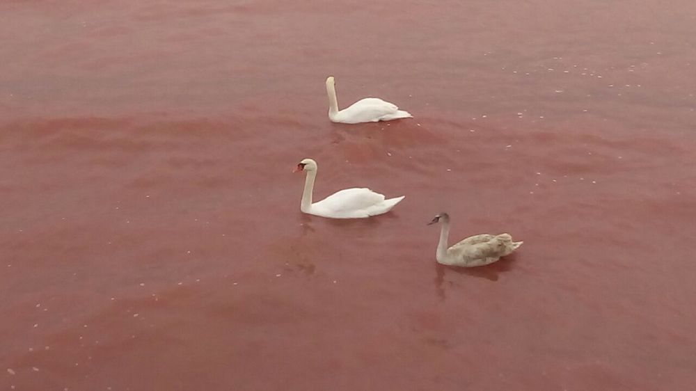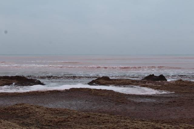 Вода в море окрасилась в красный цвет на набережной первого микрорайона от гостиницы «Шагала» до пляжа «Нур плаза». На берегу много тины и водорослей.