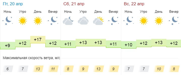 В воскресенье, 22 апреля, синоптики прогнозируют солнечную погоду. Температура воздуха днём составит +13°С, ночью +12°С. Ветер 8-10 м/с.
